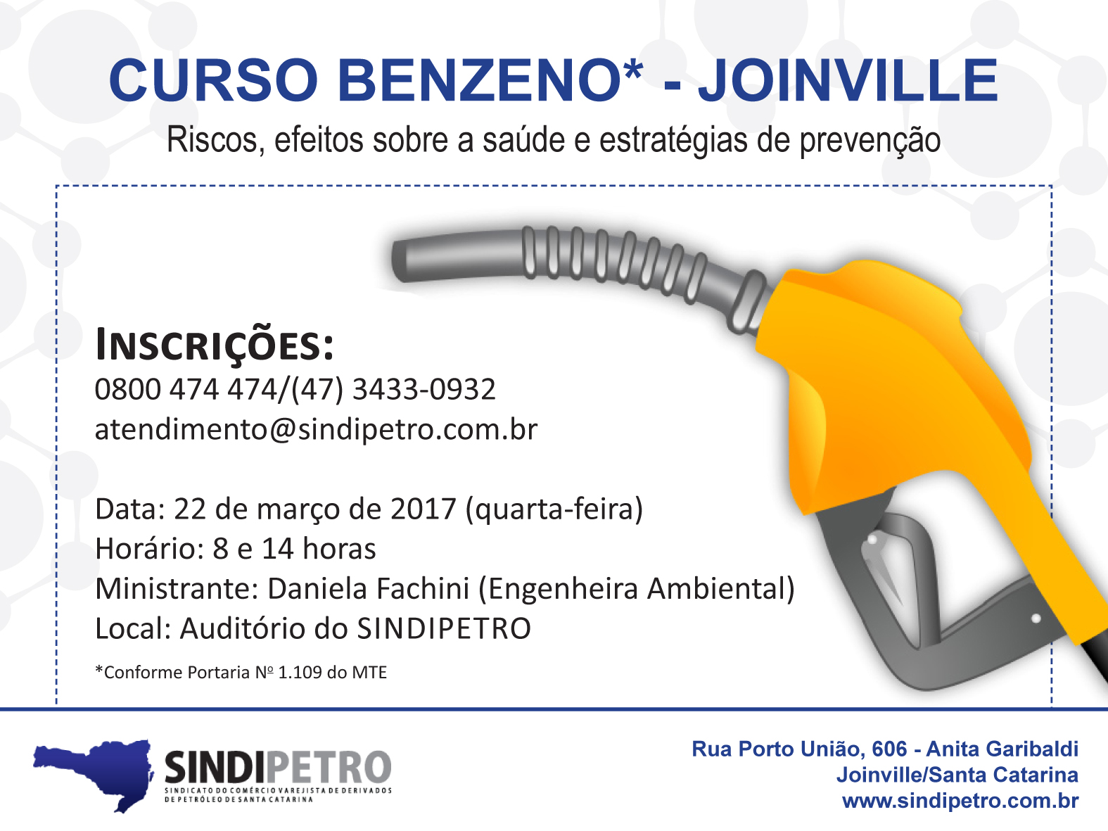A palestra é gratuita a todos os associados e será realizada no auditório do sindicato, na rua Porto União, 606, bairro Anita Garibaldi, em Joinville. Anote na sua agenda e venha participar com a gente, sua presença é muito importante! Mais informações 0800 474 474 ou (47) 3433-0932.