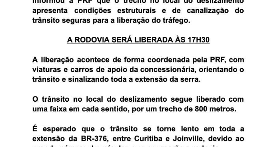 A liberação do tráfego ocorre após a realização de avaliação técnica da concessionária sobre as condições de segurança no trecho. Trabalhos de limpeza, drenagem, recuperação de pavimento e sinalização no trecho foram realizados no local. A melhora do clima hoje permitiu a conclusão dos serviços.